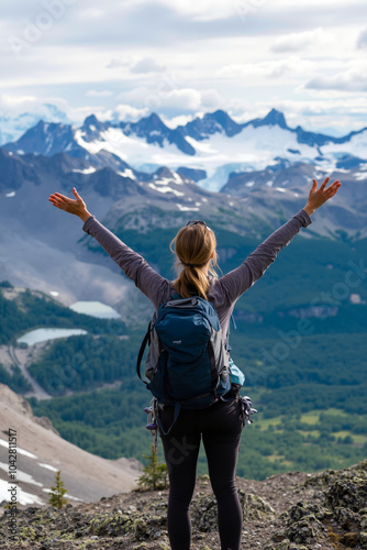 A woman with her arms outstretched, standing on a mountain peak with a backpack, looking out over a valley and mountains