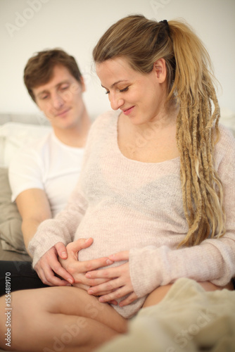 A woman with long hair is sitting on a bed with a man. The woman is pregnant and the man is holding her hand. Scene is tender and loving