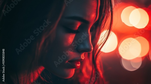 A woman with long hair poses in profile, softly lit by vibrant red lights during dusk. The background features blurred orbs of color, creating a warm, atmospheric feel