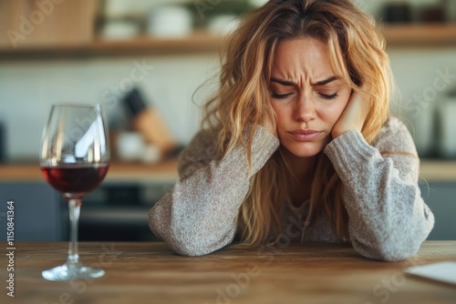 A woman with long hair sits at a wooden table, looking pensive and thoughtful, resting her head on her hands, with a glass of red wine in front of her.