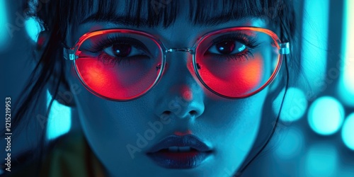 A woman with red glasses is staring at the camera. The image has a bold and edgy feel to it, with the red glasses and the woman's intense gaze. The blue background adds a sense of depth