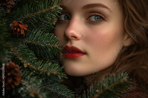 A woman with red lipstick hiding behind a pine tree, possibly seeking shelter or concealment