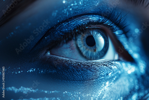 A woman's eye is painted blue with glitter