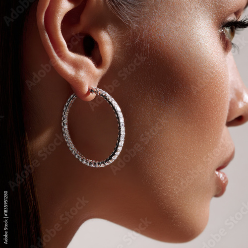 A woman's face highlighting her ear adorned with a sparkling silver hoop earring encrusted with small shimmering diamonds, skin with radiant glow, detailed textures, natural