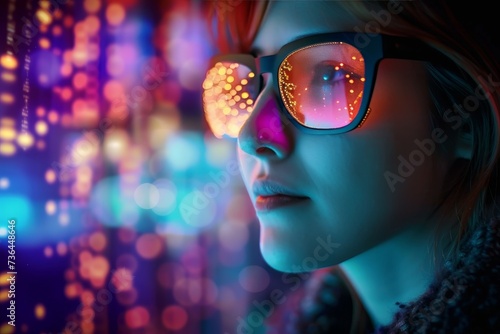 A woman's face illuminated by the city lights, adorned with sunglasses that reflect the bustling night scene