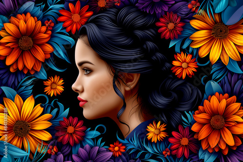 A woman's face is surrounded by a colorful flower arrangement. The flowers are in various shades of orange, yellow, and purple, creating a vibrant and lively atmosphere