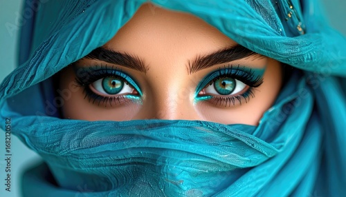 A woman's face obscured by a flowing, turquoise veil, accentuating her bright, mesmerizing aqua eyes with matching eyeshadow. Close up, detailed, ethereal