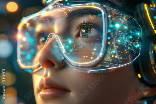 A woman's face reflects the blinding light through her futuristic goggles, capturing the essence of technological evolution and human adaptability