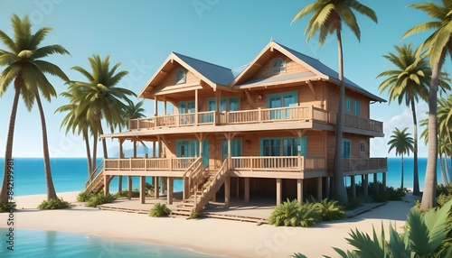 A wooden beach house with a wraparound porch, overlooking a serene beach and turquoise waters, framed by tall palm trees and a bright, sunny sky.