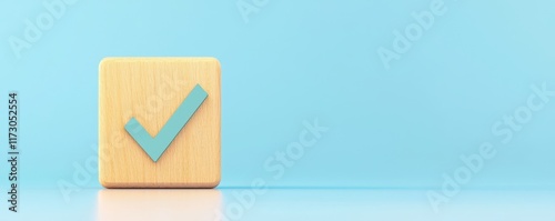 A wooden block with a blue checkmark against a light blue backdrop, symbolizing confirmation, approval, or successful completion.