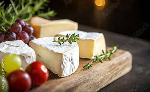 A wooden board displays assorted soft cheeses, grapes, and cherry tomatoes, creating a rustic and appetizing scene.
