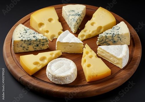 A wooden board with assorted cheeses including swiss, blue, and brie on a dark background surface