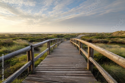 A wooden boardwalk leads into a serene coastal landscape at sunrise