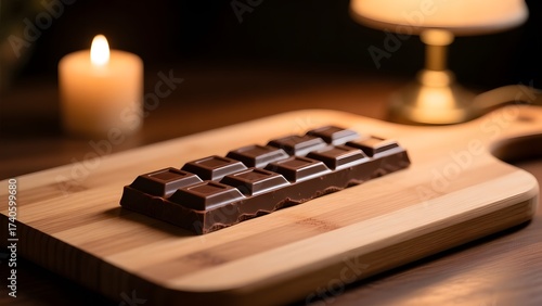 A wooden cutting board with chocolate bars on top