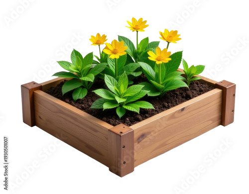 A wooden planter filled with bright yellow flowers, perfect for any spring or summer decor