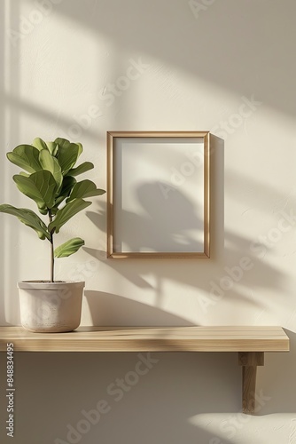 a wooden shelf with an empty frame and a potted plant, in the style of light brown and beige, 8k resolution, matte photo mockup,