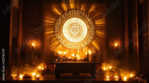 A wooden shrine surrounded by candles and incense, bathed in warm light, creating a sacred atmosphere.