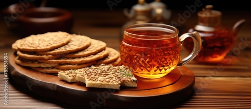 A wooden table displays a plate of crackers and a mug of tea, in a simple and rustic setting. The crackers appear crispy, and the tea steams gently.