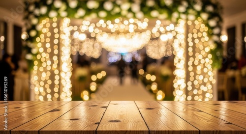 A wooden table stands before a blurred wedding archway adorned with lights and flowers