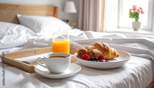 A wooden tray holds a breakfast of coffee, orange juice, croissants and berries on white bedding beside a sunny window with flowers