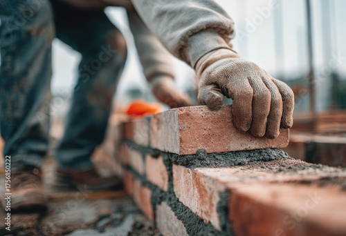A worker, gloved hands, carefully places a brick in mortar to build a wall during daylight