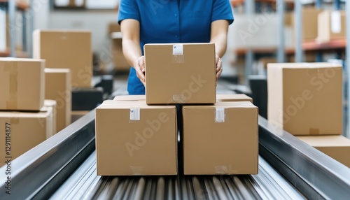 A worker organizes cardboard boxes on a conveyor belt in a modern warehouse for efficient distribution and logistics.