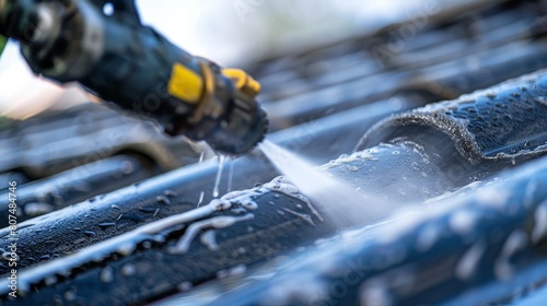 A worker robot engages in high-pressure washing of a roof, detailed view showing the effectiveness of automated cleaning services