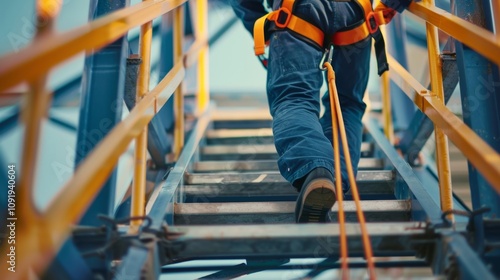 A worker using a harness and lanyard to safely ascend a ladder highlighting the importance of proper fall protection equipment.