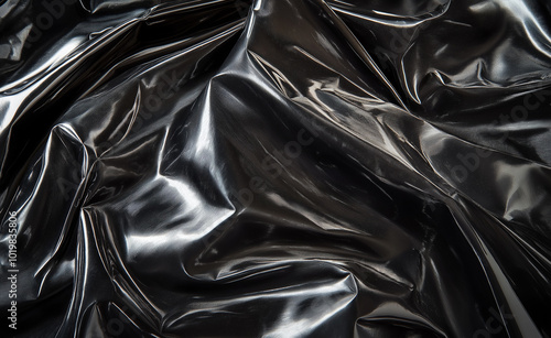 A wrinkled and glossy black plastic material forming abstract patterns and textures.