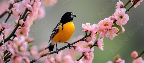 A yellow and black bird perched on a branch of a tree in a contemporary apartment with a panoramic view.