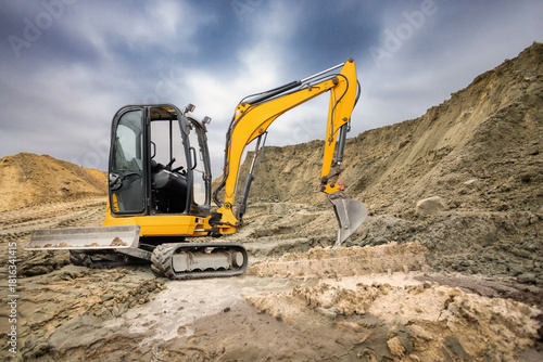 A yellow excavator operates at a construction site, digging into the earth and moving dirt under a cloudy sky in the background