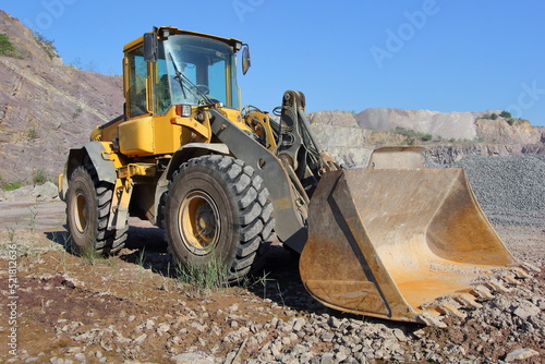 a yellow loader (tractor) in the middle of a stone quarry