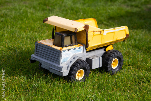 A yellow metal toy construction truck