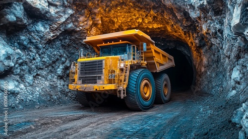 A yellow mining dump truck drives through a tunnel in a rock quarry.