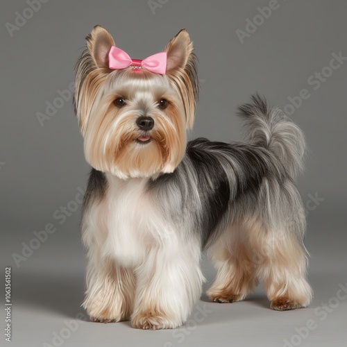 A Yorkshire Terrier with a pink bow stands elegantly against a gray background.