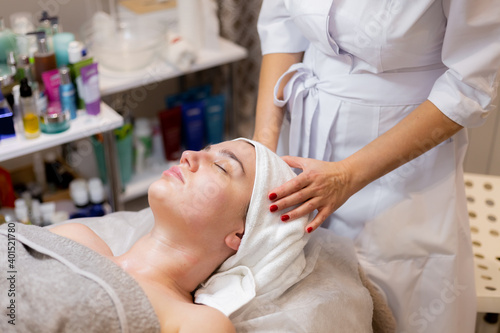 A young beautiful girl lies on the beautician's table and receives procedures, a light facial massage. Woman takes care of herself, enjoys massage