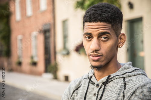 A young, black hipster poses for a candid photograph in NYC