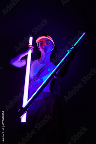 A young Black woman poses in a studio setting with neon lights, sporting a casual yet stylish outfit.