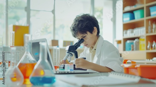 A young boy, dressed in a white lab coat, closely examines a specimen under a microscope in a brightly-lit school laboratory.