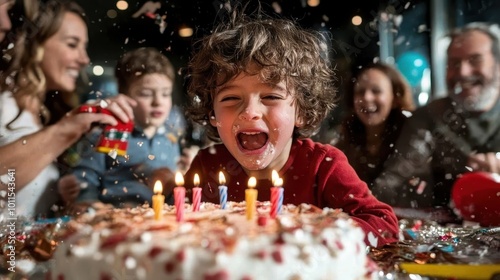 A young boy happily enjoys his birthday cake surrounded by family members laughing, as confetti drifts down in a festive and joyous celebration of his special day.