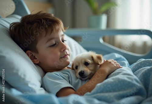 A young boy resting in a hospital bed embraces a small puppy. Their connection brings a sense of comfort and hope amid the challenges of illness and recovery. Generative AI
