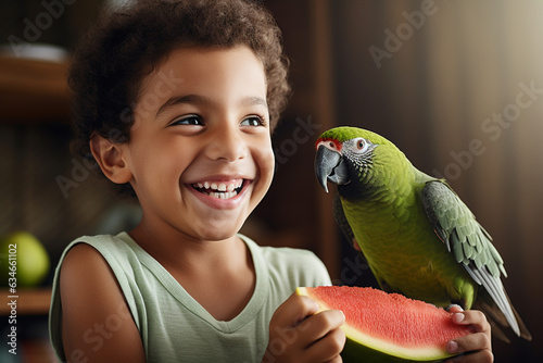 A young boy sharing a piece of watermelon with a friendly parrot on his shoulder, friendship with animals Generative AI