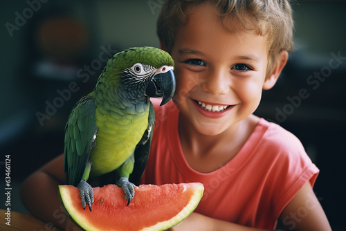 A young boy sharing a piece of watermelon with a friendly parrot on his shoulder, friendship with animals Generative AI