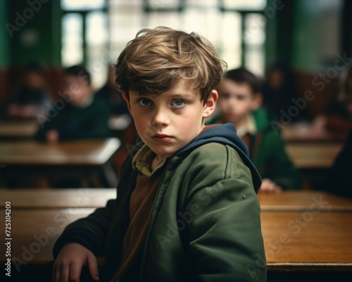 A young boy sitting at a desk in a classroom. Generative AI.