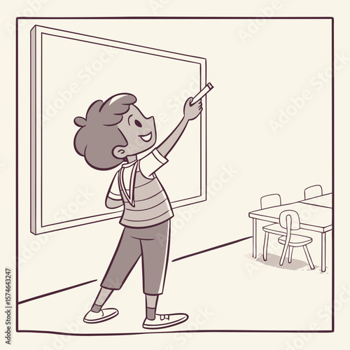 A young boy writing on a whiteboard in a classroom with a table and chairs in the background view scene