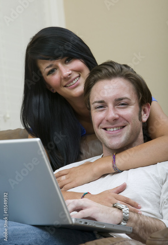 A young couple relaxing while on the computer at home