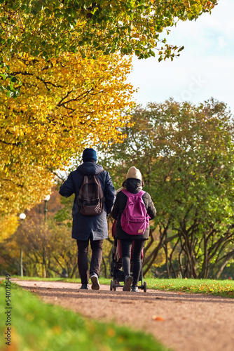 A young family walks in the autumn park. Dad with mom and baby in a stroller for a walk.