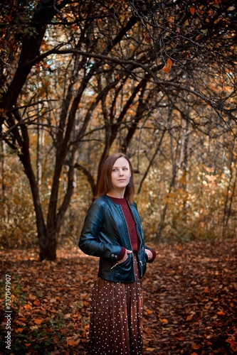 A young ginger girl portrait standing in the autumn park next to autumn tree