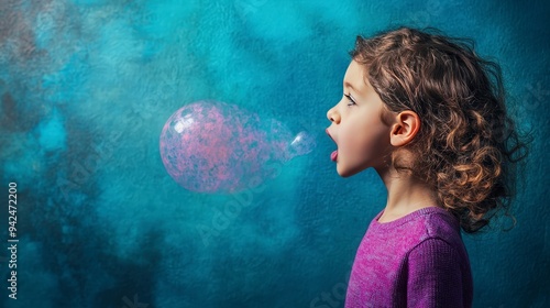 A young girl blowing a colorful bubble gum bubble against a textured background.