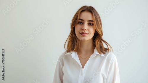 a young girl in a white blouse on a white background.